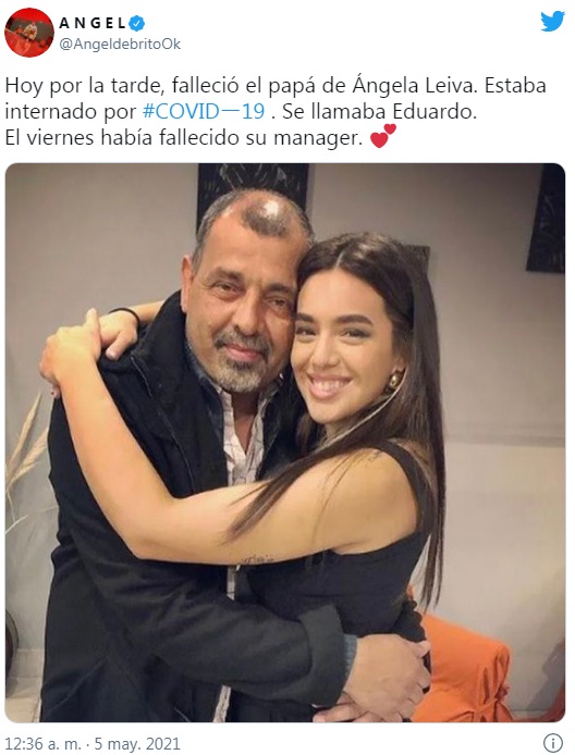 Y en las últimas horas, se supo el terrible desenlace de su papá: "Falleció el papá de Ángela Leiva. Estaba internado por Covid-19. Se llamaba Eduardo. El viernes había fallecido su manager", informó Ángel de Brito desde Twitter.